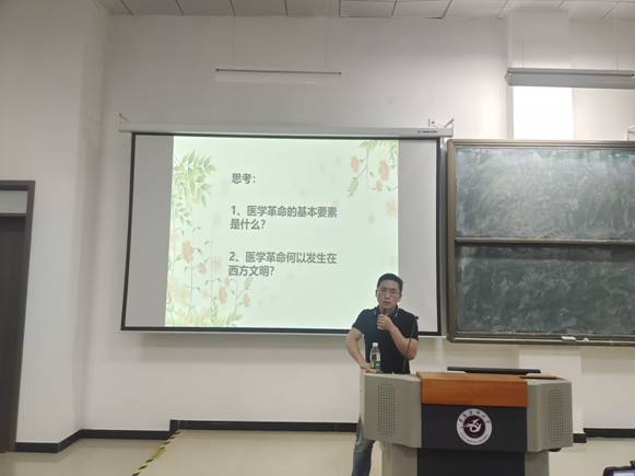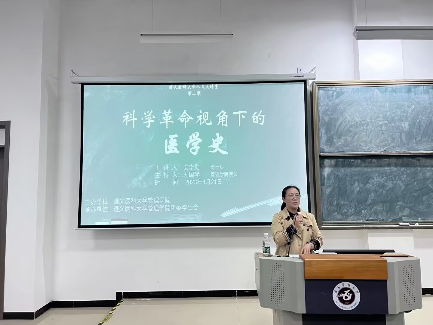 在世界读书日来临之际,为配合学校推广全民阅读,建设书香校园,向我校广大师生传播医学人文知识、提高文学素养,引领广大师生传承中华经典、弘扬民族文化,遵义医科大学于2023年4月21日晚上7点在第三教学楼18阶梯教室开展了“人文大讲堂”主题系列讲座第二期——《科学革命视角下的医学史》。本次讲座由遵义医科大学管理学院主办,管理学院团委学生会承办,人文医学研究中心姜李勤博士后主讲,管理学院院长刘国琴教授主持。