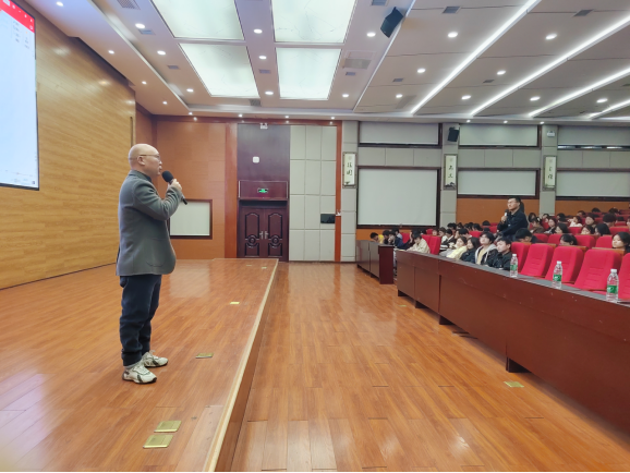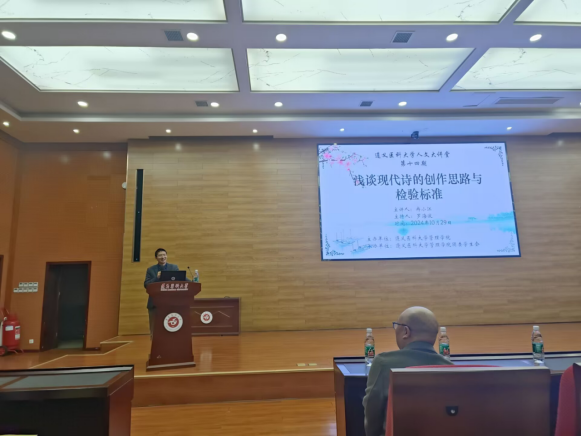 为拓宽提升学生的思维领域品质、,培养语言能力鉴赏艺术,加强新时代人文教育,提高同学们的人文素养和文化认知,了解现代诗的文化意义,遵义医科大学于2024年10月29日在道德讲堂组织开展了“人文大讲堂”主题系列讲座第十四期(2024年第6期)——《浅谈现代诗的创作思路与检验标准》。本次讲座由遵义医科大学管理学院主办,遵义医科大学管理学院团委学生会承办,中国作家协会会员冉小江主讲,遵义市文艺理论家协会副主席、管理学院罗海波老师主持。