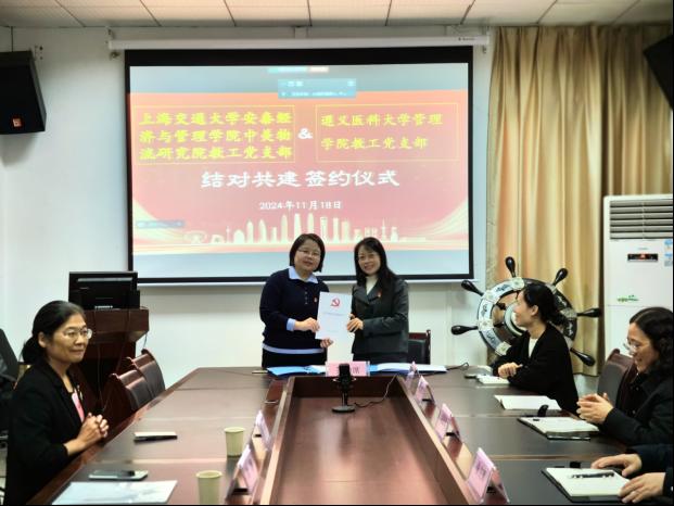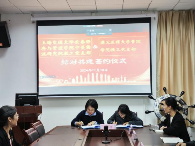 为深入学习贯彻习近平总书记关于党的建设的重要思想,全面巩固拓展学习贯彻习近平新时代中国特色社会主义思想主题教育成果,加强基层党组织之间的交流与合作,共同探索党建工作新思路、新方法,以高质量党建引领学院高质量发展,11月18日上午,遵义医科大学管理学院教工党支部与上海交通大学安泰经济与管理学院中美物流研究院教工党支部在管理学院二楼会议室开展了结对共建签约仪式,仪式由遵义医科大学管理学院党委书记张文辉主持,管理学院教工党支部和中美物流研究院教工党支部的教工党员们分别通过线下和线上的形式参加了签约仪式。
