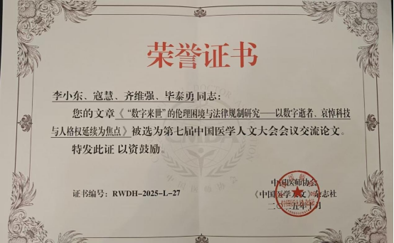 2025年11月8日,第七届中国医学人文大会暨广东省医师协会人文医学专业委员会学术会议在深圳召开。大会青年论坛上,遵义医科大学人文医学研究中心硕士研究生李小东凭借论文《“数字来世”的伦理困境与法律规制研究——以数字逝者、哀悼科技与人格权延续为焦点》荣获优秀论文奖,并作为优秀论文代表作大会汇报。本次大会共收到来自全国的305篇论文,评选出了37篇优秀论文,其中有15篇得以在会上进行汇报。