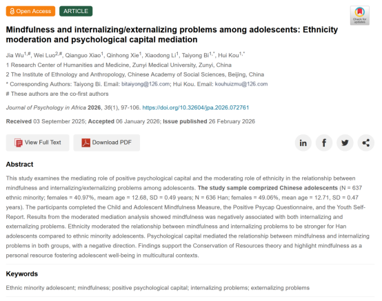 近日,遵义医科大学管理学院(人文医学研究中心)2023级人文医学专业硕士研究生吴佳以第一作者身份,在SSCI期刊《Journal of Psychology in Africa》发表学术论文,论文题为“How Mindfulness Affects Internalizing/Externalizing Problems Among Adolescents in Southwest China: A Moderated Mediation Model”。该研究由毕泰勇教授、寇慧博士担任共同通讯作者,获中国社会科学院项目、贵州省科技计划,以及贵州省研究生科研基金、遵义医科大学研究生科研基金等项目联合资助,是中心人文医学学科研究生科研培养的重要成果。